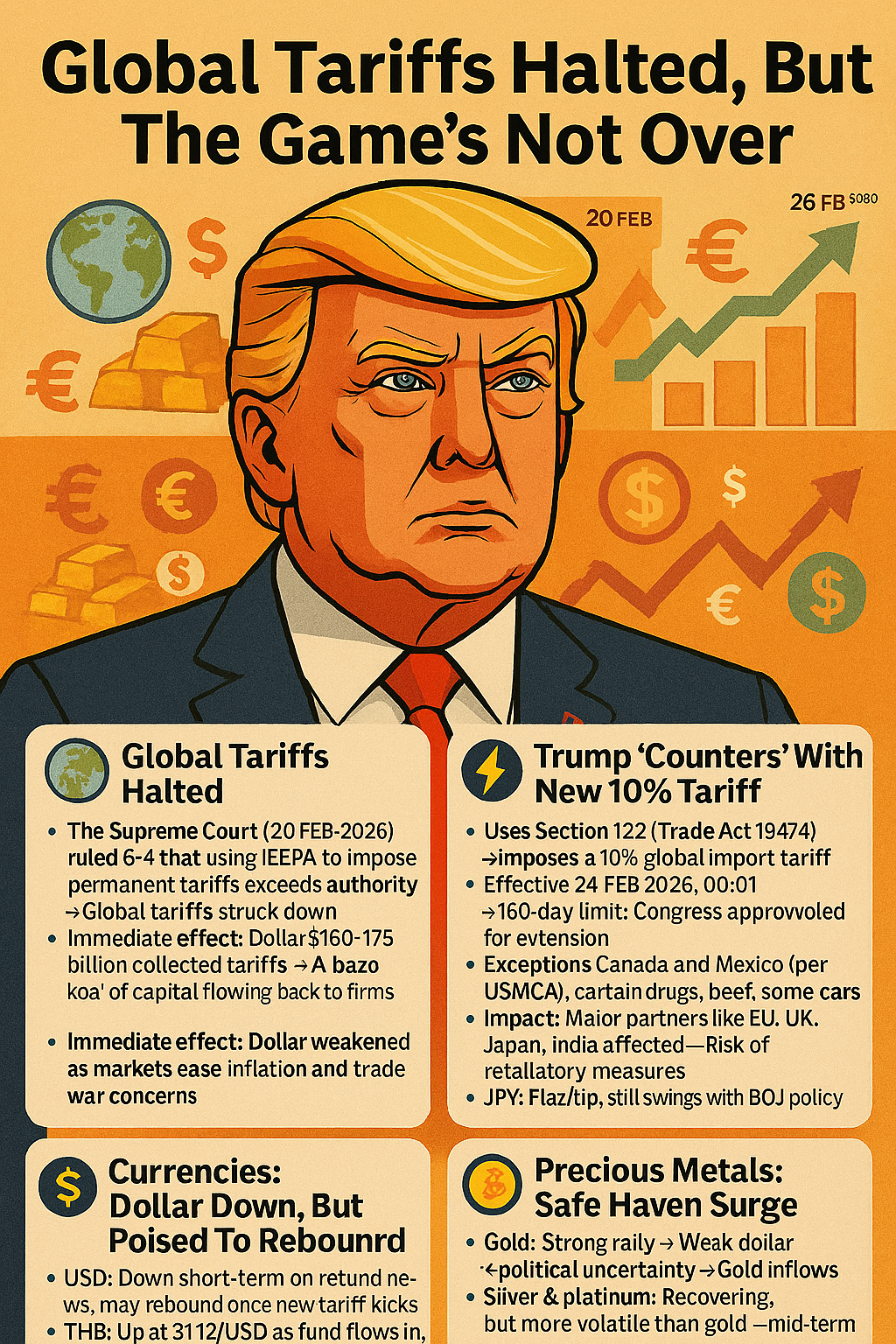Trump 2.0: The Tariff Game Isn’t Over The Supreme Court halts global tariffs — but Trump strikes back instantly! Old tariffs are gone, new ones arrive: a fresh 10% global tariff kicks in on February 24, 2026. How much will this hit our wallets? Stay tuned