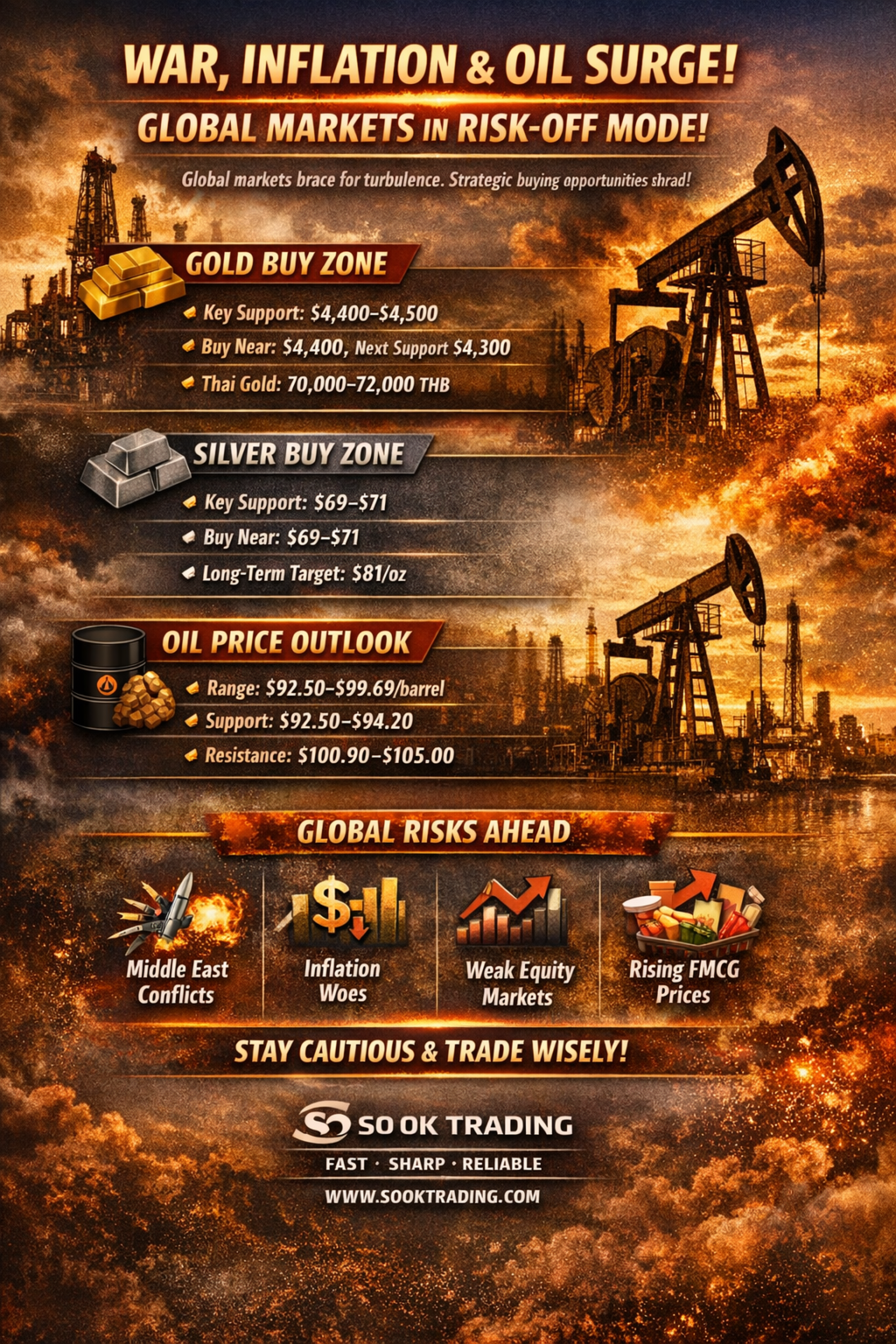 “War Heats Up – Inflation Soars – Oil on Fire! Price and Trend Outlook for Gold, Silver, and Global Stock Markets in the Week of March 23–27, 2026: Article by SO OK TRADING”