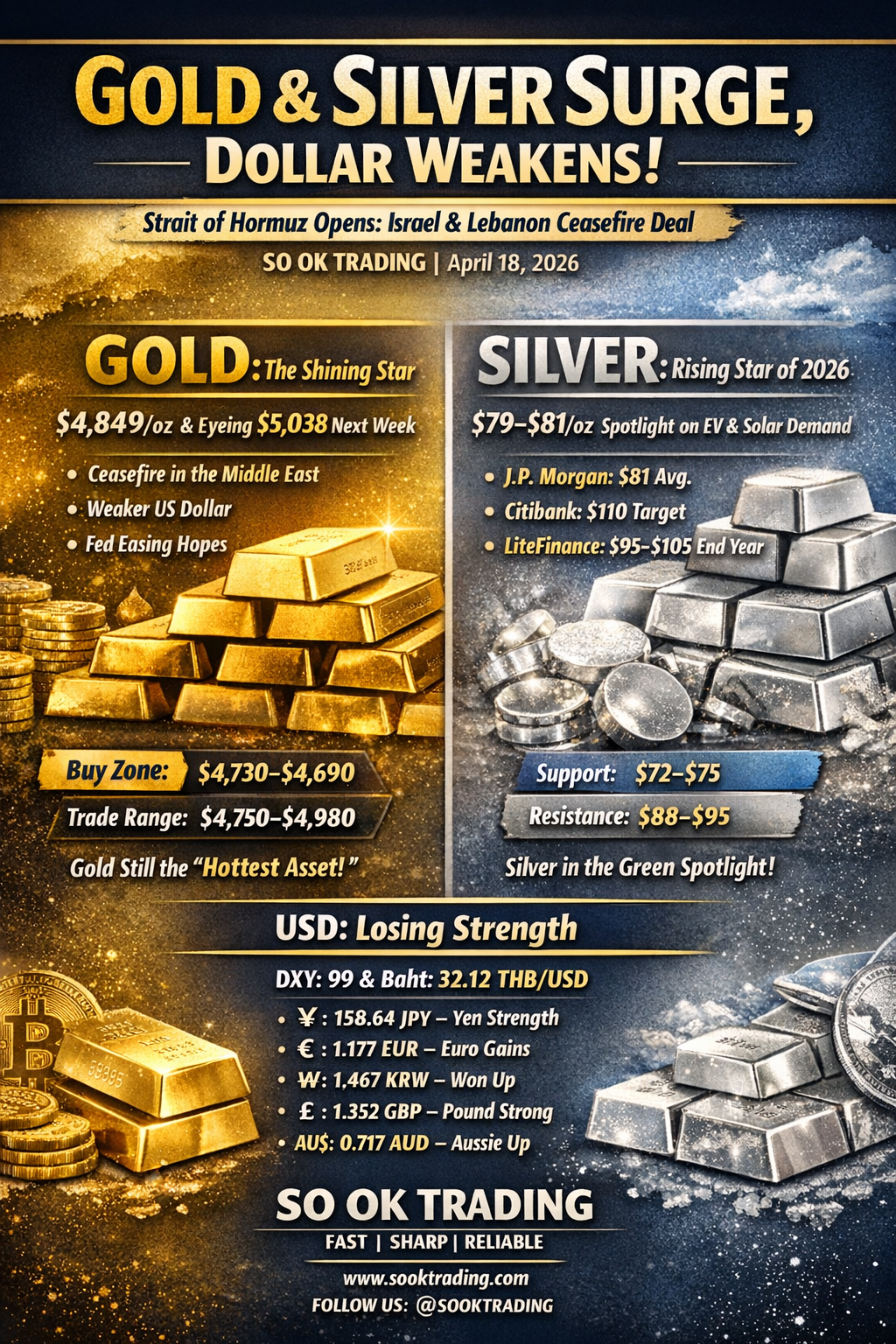 Gold and Silver Surge, Dollar Weakens”: After Iran Fully Reopens the Strait of Hormuz Following Israel–Lebanon Ceasefire — Article by SO OK TRADING | April 18, 2026