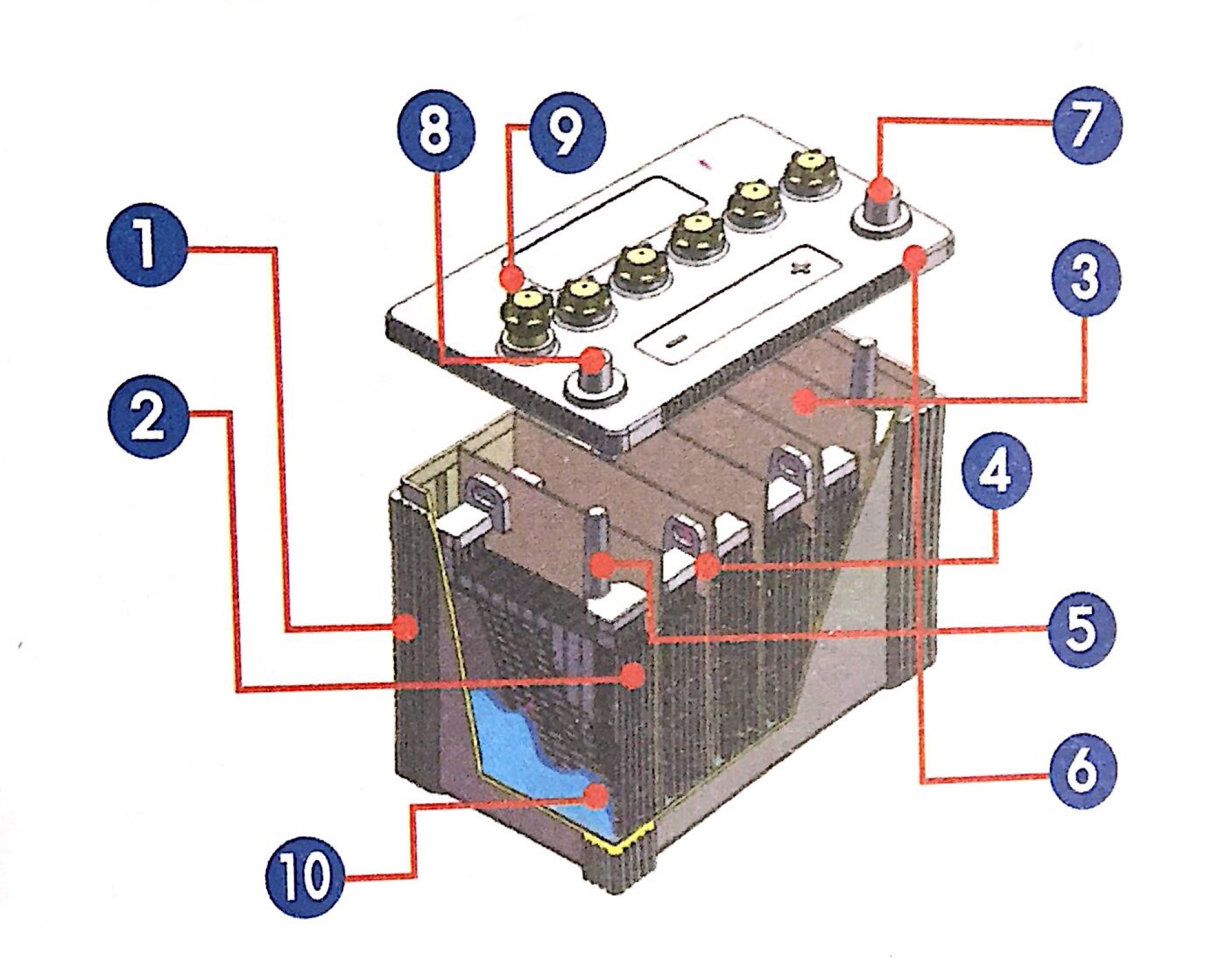 แผ่นกั้น: เป็นฉนวนป้องกันไม่ให้แผ่นธาตุบวกและลบสัมผัสกันสารละลายอิเล็กโทรไลต์: กรดซัลฟิวริก (กรดกำมะถัน) ที่ทำหน้าที่เป็นตัวกลางในการเกิดปฏิกิริยาเคมี