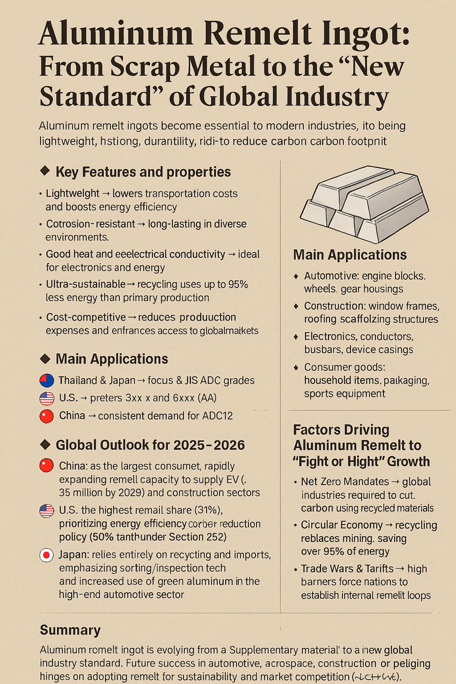 铝再熔锭正在从“辅助材料”演变为 全球产业的新标准。无论是汽车、航空航天、建筑还是包装,采用再熔铝已成为确保可持续性与竞争力的关键。
