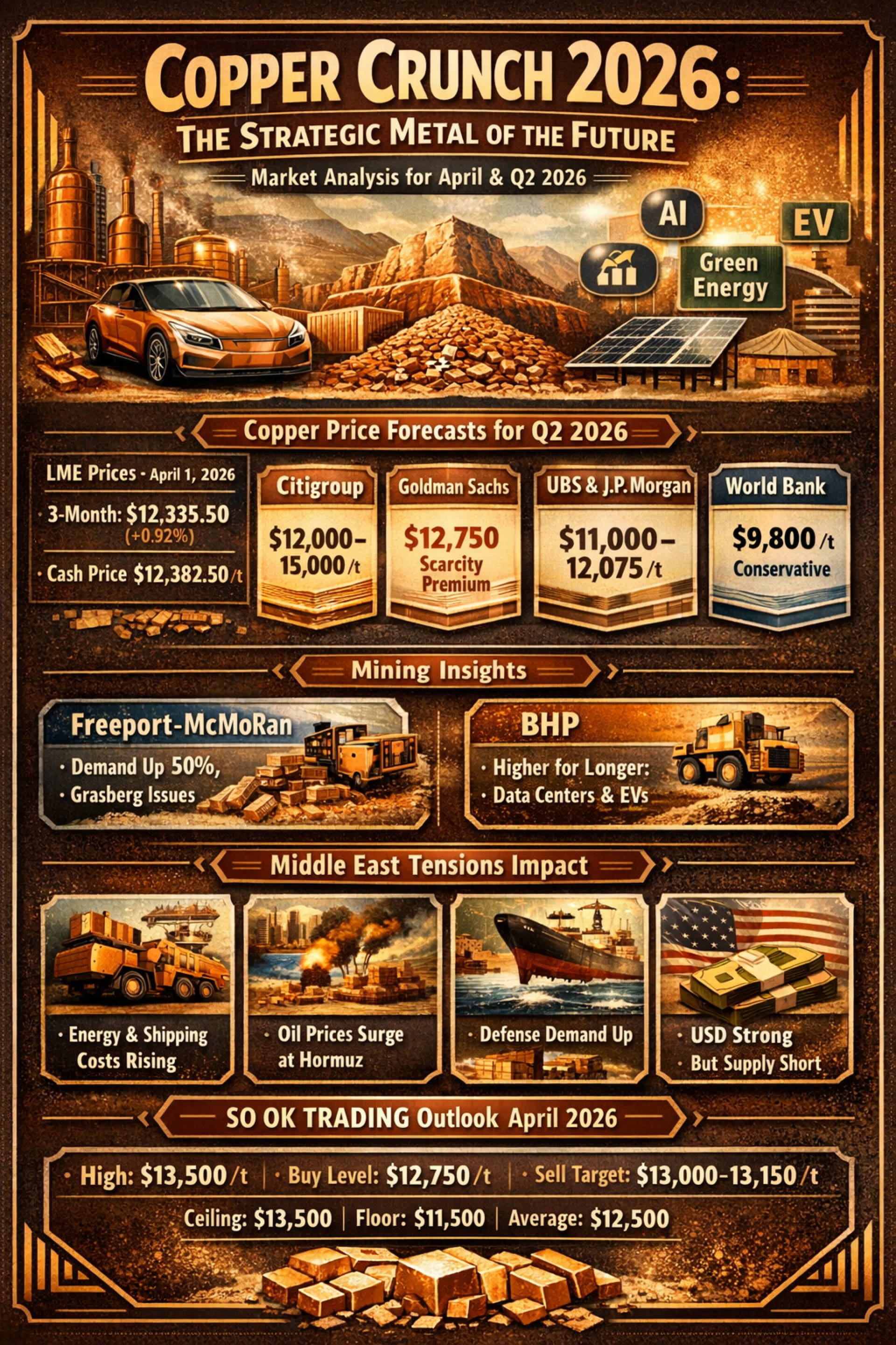Copper Crunch 2026: เมื่อทองแดงกลายเป็น “โลหะยุทธศาสตร์” ของโลกอนาคต : วิเคราะห์แนวโน้มราคาทองแดง และ สถานการณ์ทองแดง ในเดือนเมษายน 2026 และ Q2/2026 : - ประเมินราคาเข้าซื้อ จุดควรซื้อ เพื่อกำไรสูงสุดของกิจการ : บทความโดย SO OK TRADING : 1 เมษายน 2026