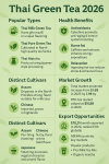 ชาเขียวใบล้วน (Thai Pure Green Tea): ปลูกในพื้นที่คุณภาพสูง เช่น เชียงรายและเชียงใหม่ ได้รับรางวัลระดับโลก เหมาะสำหรับตลาดพรีเมียม