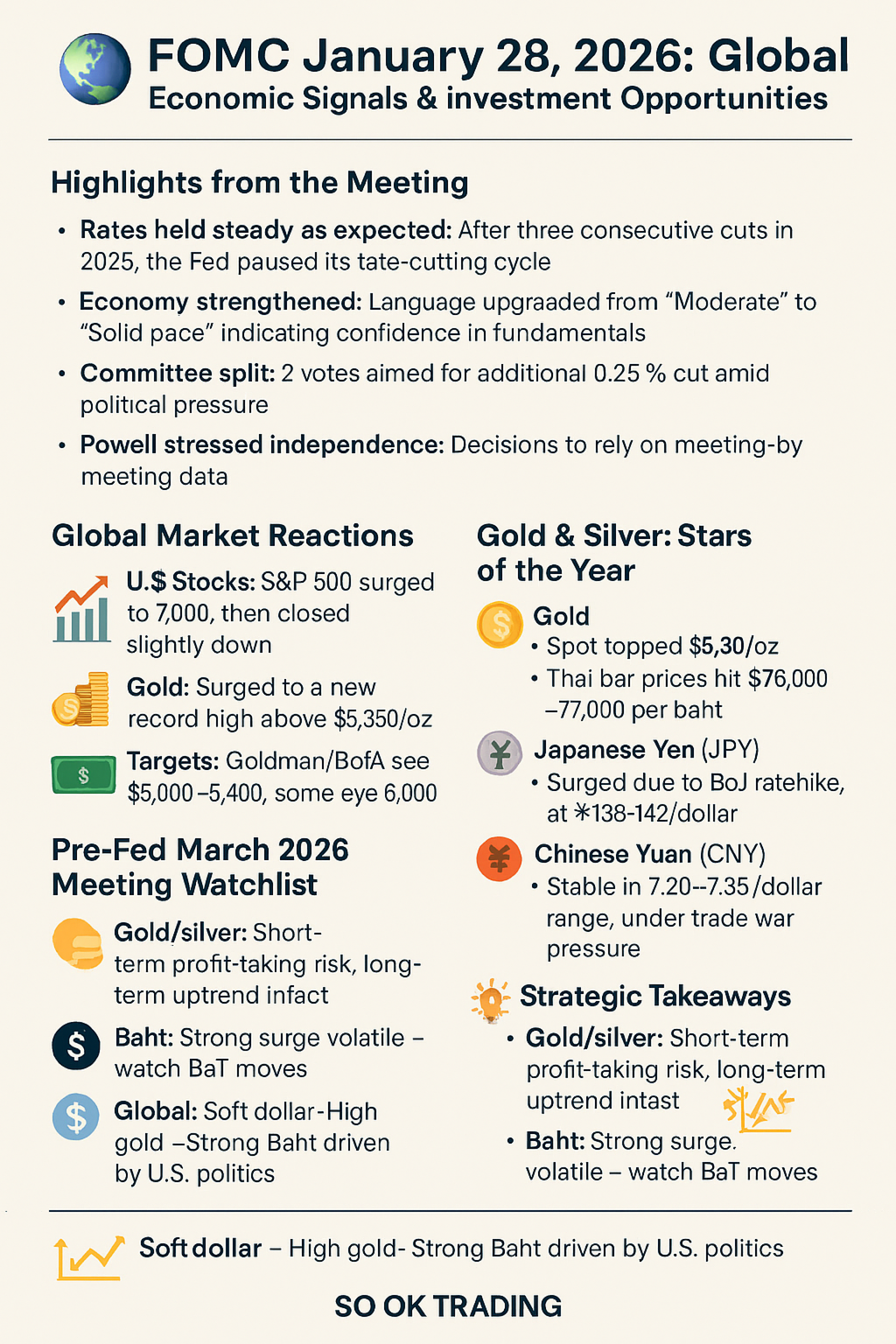 เจาะลึกทิศทางโลกหลัง FED แถลง: เมื่อทองคำพุ่งทะยาน และเงินบาทแข็งค่าสุดในรอบปี 29.1.2026 ฺBy SO OK TRADING